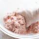 ボウルの上にザルをのせ、ザルに厚揚げを入れます。熱湯を厚揚げの上からまんべんなくかけます。ザルをあげて湯を切り、キッチンペーパーを使ってしっかりと水けを取ります。厚揚げを取り出した後の熱湯を見ると、油が浮いているのがわかるかと思います。