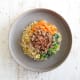 もやし・ほうれん草・人参の3色ナムルとひき肉で作るビビンバです。野菜もたくさん取れて、見た目も色とりどりで楽しめる一品です。